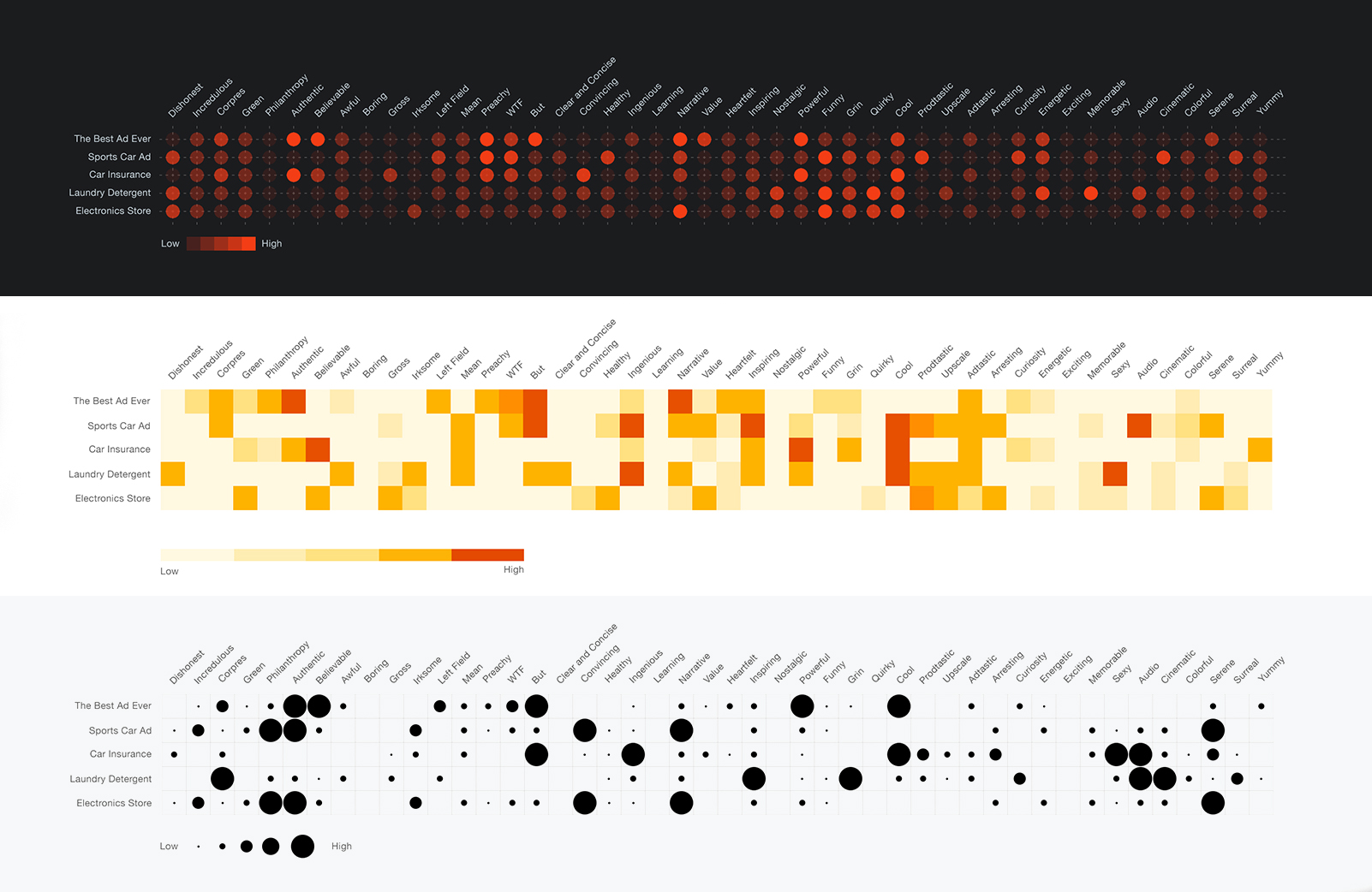 HEATMAPS Without a doubt, the best way to scan a vast amount of data and try to find something valuable is with the help of heatmaps. When we decided to implement our heatmap in order to plot 46 emotions I spent a little bit of time mocking up a few different styles in order to help us narrow down which one worked best for us. Inevitably, we decided to go with the simple grid of squares and find a color palette that made it very easy to spot any patterns that may be occurring in a group of ads.