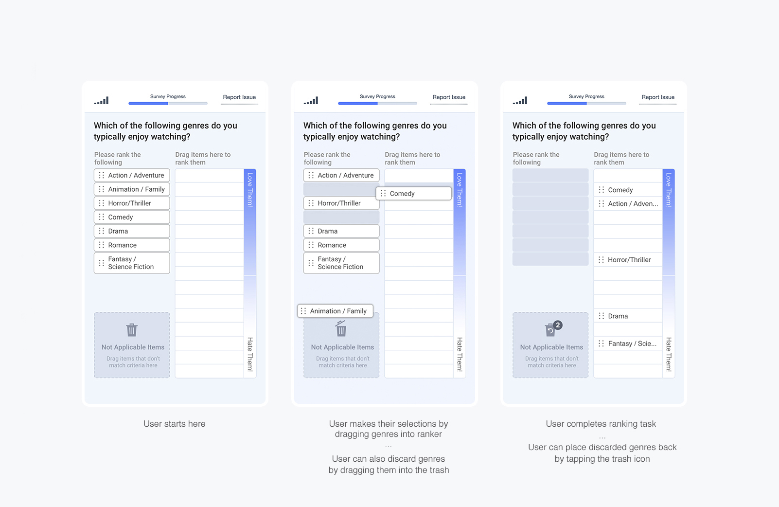 MOBILE SURVEY In 2020, Ace Metrix decided to deliver our surveys exclusively on mobile. For most of the demographic questions the decision to go mobile-only wasn’t a major issue because the survey is mostly input fields and checkboxes. Some of the questions, however, such as our Ranker question required some extra effort. Ranker questions allows the user to order a number of items from how much they loved something versus how much they hated it. One of the directions from the R&D team was that there must also be areas of empty spaces in order to improve the data’s accuracy. So we were able to come up with a way for the user to simply use their finger and place the items in any order they wanted, leaving gaps wherever they thought was necessary.