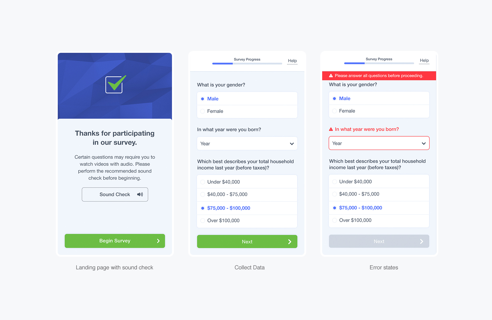 SURVEY One of the most important products of Ace Metrix’s business was the collection of surveys and their responses. Visually, the survey was designed to be free of too many distractions on purpose so it would have as little impact on the user’s decision making. By using a light color palette I was able to achieve an airy and clean feel throughout a survey that would often be busy. We refrained from using greens in the questions because they carry some connotations of doing something correctly and kept the red hues strictly for error states.