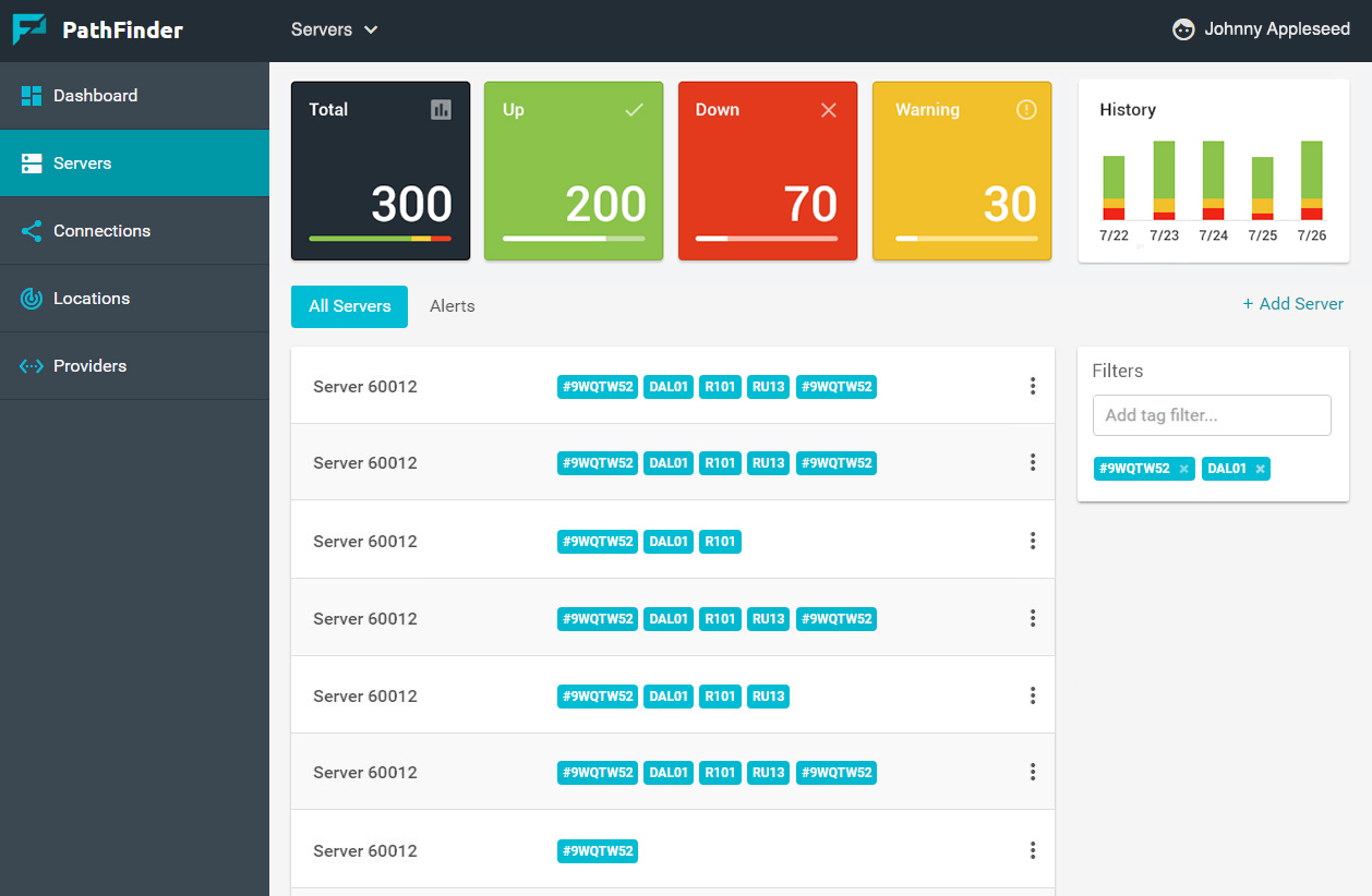 DASHBOARD GameBlocks creates middleware that allows videogame publishers to combat hacking, manage gameplay, and display uptime. I was brought on the team for a 3-month contract in order to help the developers create a visually pleasing dashboard. The PathFinder project was supposed to help monitor all connections to the servers, and between the servers and every client connected to the servers. Because this was geared toward video game enthusiasts we were able to use an exciting color palette and modern design trends.
