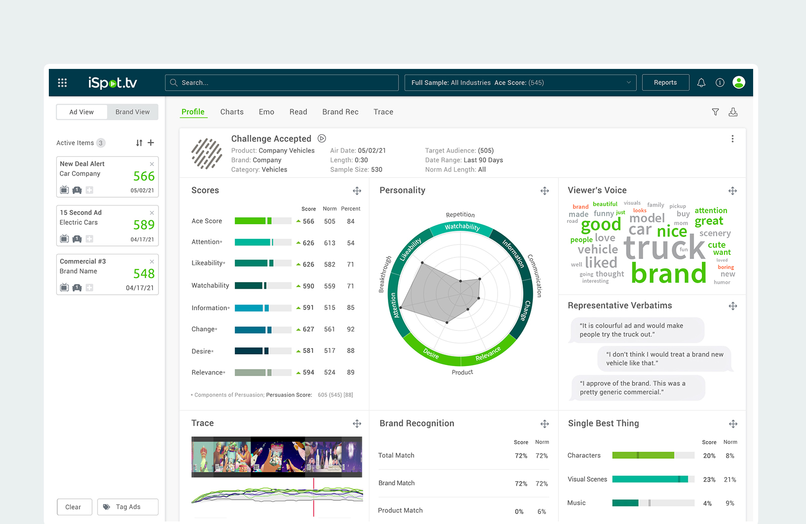 INTEGRATE ACE METRIX AND ISPOT.TV Ace Metrix and iSpot had dashboards that were different both visually and in the data they provided. Since I had experience working with Ace’s data, I was tasked with making sure the new visualizations blended in seamlessly with iSpot’s branding and style guide. In order to create less disruption to the end-user we decided to try and keep as much of the original UX as we could while still matching the new design. This would ensure that anyone with access to both products would have a unified experience across the entire application