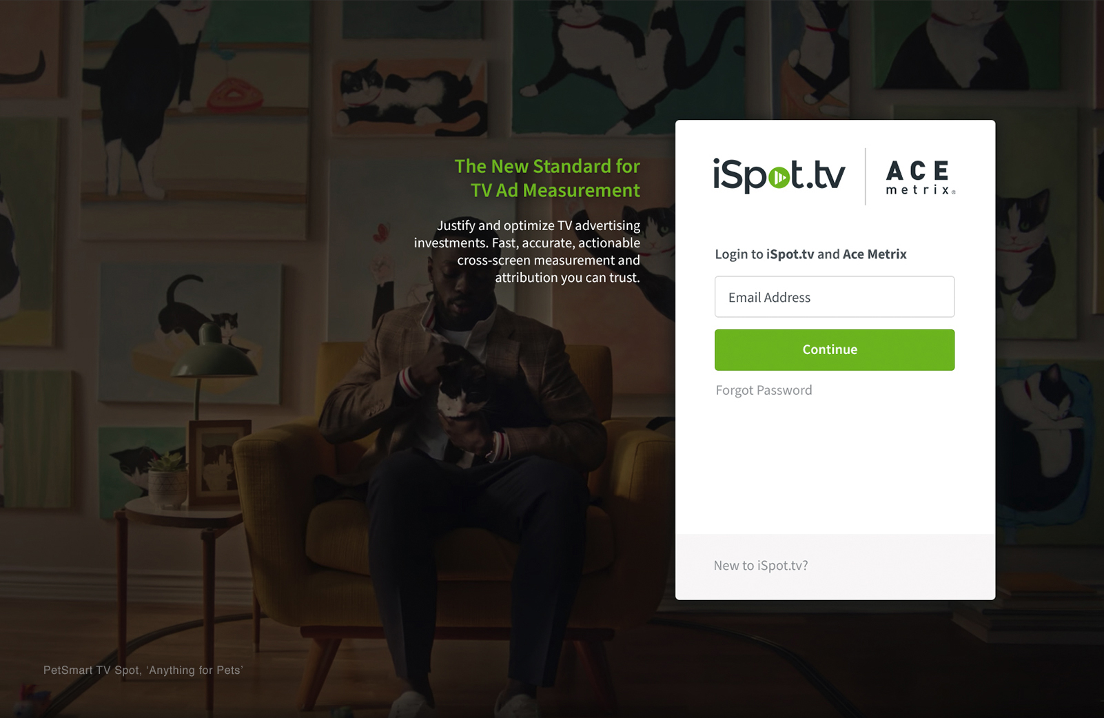 SINGLE SIGN-ON LOGIN PAGE Following iSpot’s acquisition of Ace Metrix, one of my first tasks was to help seamlessly unite the two brands into one. The first step was to make a login flow where clients from both companies could log in using the same funnel. This was an interesting project because it involved getting approval from both sides of the aisle since iSpot.tv has a very subdued professional look and feel, while Ace Metrix had a more vibrant and colorful branding.