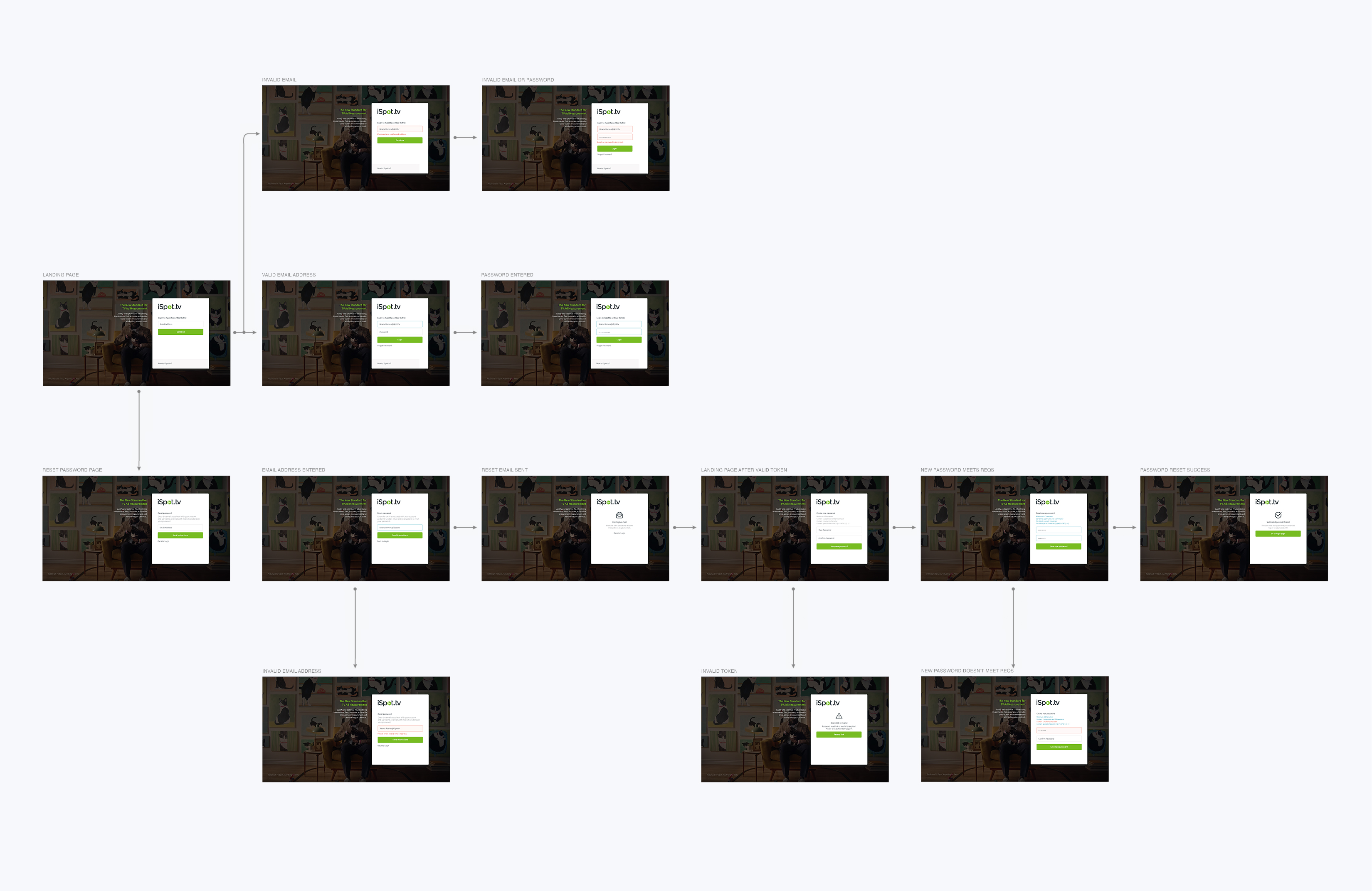JOURNEY MAP After a number of iterations, for the final design we decided to go with a large full-screen ad in the background. This was one on the ways we tried to keep the fun aspect that Ace Metrix users were used to while also creating a very clean and polished container for the actual login form. In order to keep the background fresh, the ad displayed changes once a week depending on what the top-scoring ad is for that week. The login form is pushed to the right in order to maximize the visibility of the ad in the background. Following the blueprint I obtained from creating the user flow, I was able to create a mockup for every possible screen that the user may come in contact with.