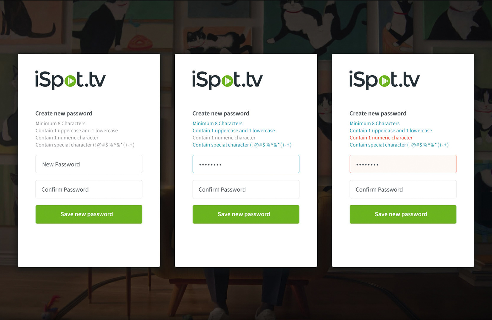 MICRO INTERACTIONS We focused a lot on the micro interactions that a user might experience while trying to sign in or change their password. Here are some screenshots of how we go about showing a user whether or not their password meets our security criteria as they are typing their new password. This prevents any confusion that might occur if the user isn't aware how secure their password has to be from the start and creates a very streamlined experience.