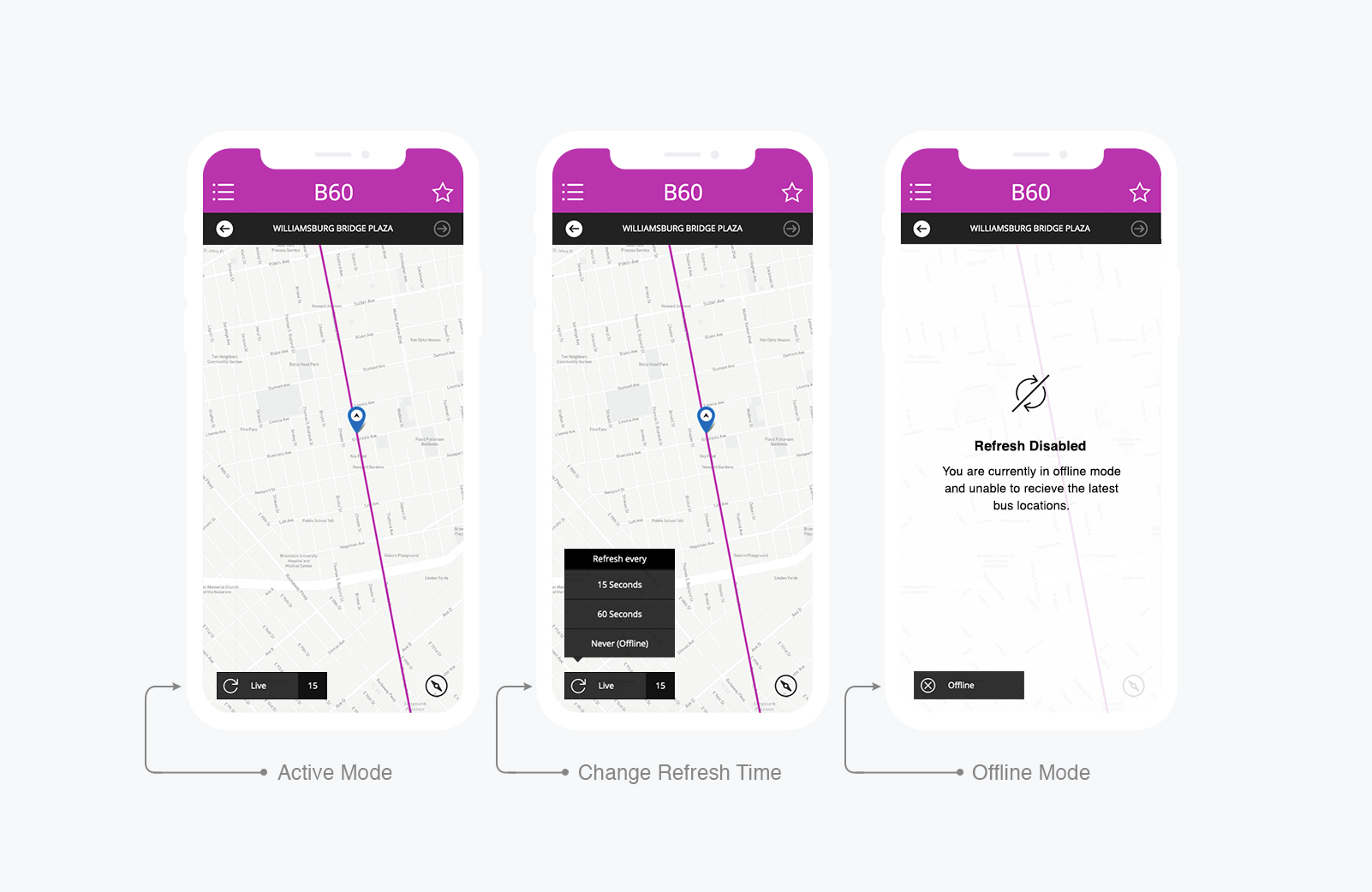 EFFICIENCY Since most commuters would use our app on their phones, we implemented a way of preserving battery life and using less of their mobile data. The user was able to toggle whether they wanted to refresh every 15 seconds, 60 seconds, or go offline completely incase they decided to grab a cup of coffee.